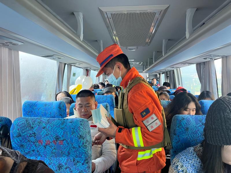 在普達(dá)措國(guó)家公園停車(chē)場(chǎng),消防指戰(zhàn)員向游客們發(fā)放《防火宣傳冊(cè)》,并將游客的火機(jī)進(jìn)行收納統(tǒng)一保管。