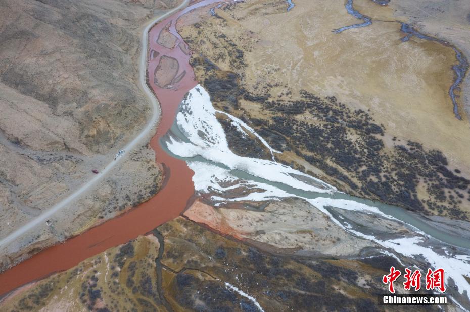 航拍一清一紅的兩條河流在香加鄉(xiāng)洪水川交匯處現(xiàn)“涇渭分明”景觀。馬銘言 攝