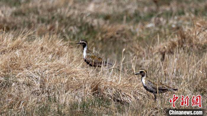 圖為金斑鸻在草叢覓食??唆斂撕兴睾匀槐Wo(hù)區(qū) 攝