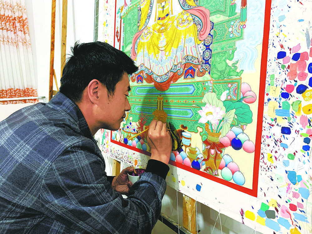 制作畫框、繃展畫布、打磨布畫、起稿構(gòu)圖、上色暈染、勾復(fù)線、描金再到佛像開眼、唐卡裝裱,每天在畫室8個(gè)小時(shí),桑杰卡不間斷地學(xué)習(xí)著唐卡制作工藝流程。從摸索前進(jìn)到可以獨(dú)立作畫,他用了6年多的光景,初到畫苑時(shí),他才20歲。