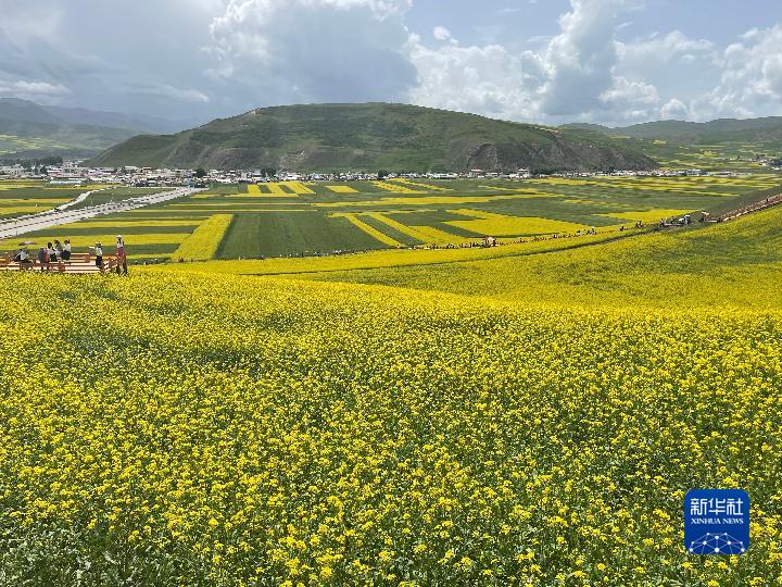 仲夏時節(jié),在青海省海北藏族自治州門源回族自治縣,百里油菜花海仿佛鋪在大地的金色畫布,與綠色的草原和連綿的雪山形成鮮明對比,共同勾勒出一幅絕美的高原風(fēng)光油畫。來自天南海北的游客漫步花海、拍照賞景,盡情享受夏日時光。