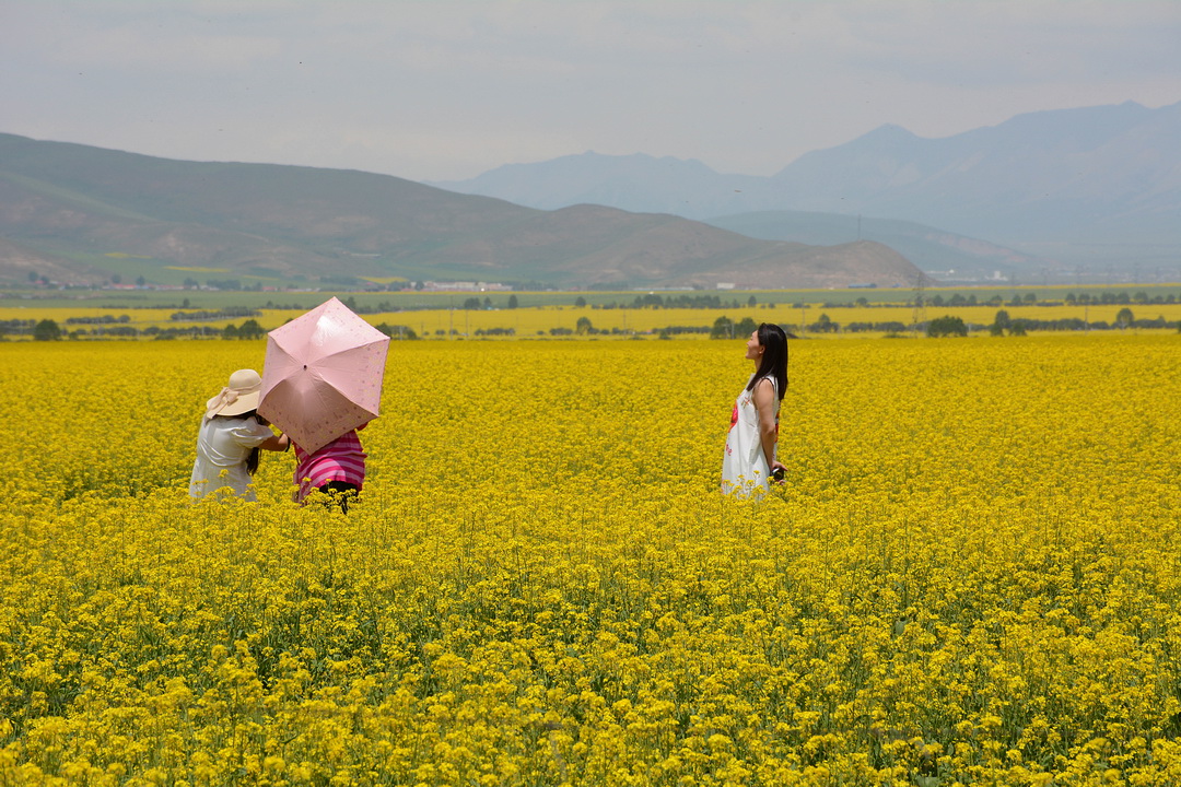 7月10日,游客在青海省海北藏族自治州門源回族自治縣的油菜花海里拍照。新華社記者 柳澤興 攝