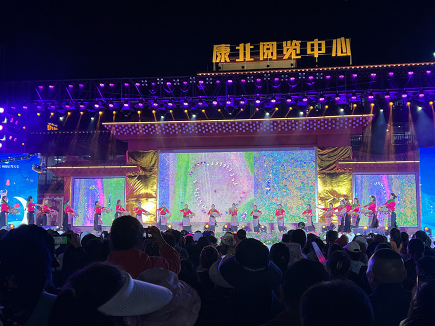 隨后,《高原的春天》《草原情歌》《甘孜布姆》《圣康田園》等節(jié)目相繼上演。在絢麗的舞臺效果襯托下,在歡樂的氣氛烘托中,偌大的廣場上座無虛席,臺上臺下沉浸在一片歡樂的海洋中,大家紛紛報(bào)以熱烈掌聲和陣陣喝彩。