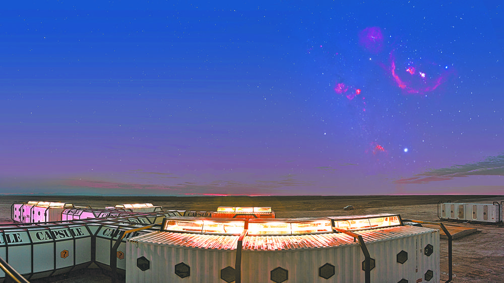 “我們的建筑風(fēng)格是模擬未來人類移居火星后的生存環(huán)境,有‘總部大樓’‘火星艙’等。”順著袁振民手指的方向,才發(fā)現(xiàn),原來那些白色集裝箱正是營地建筑的主體。