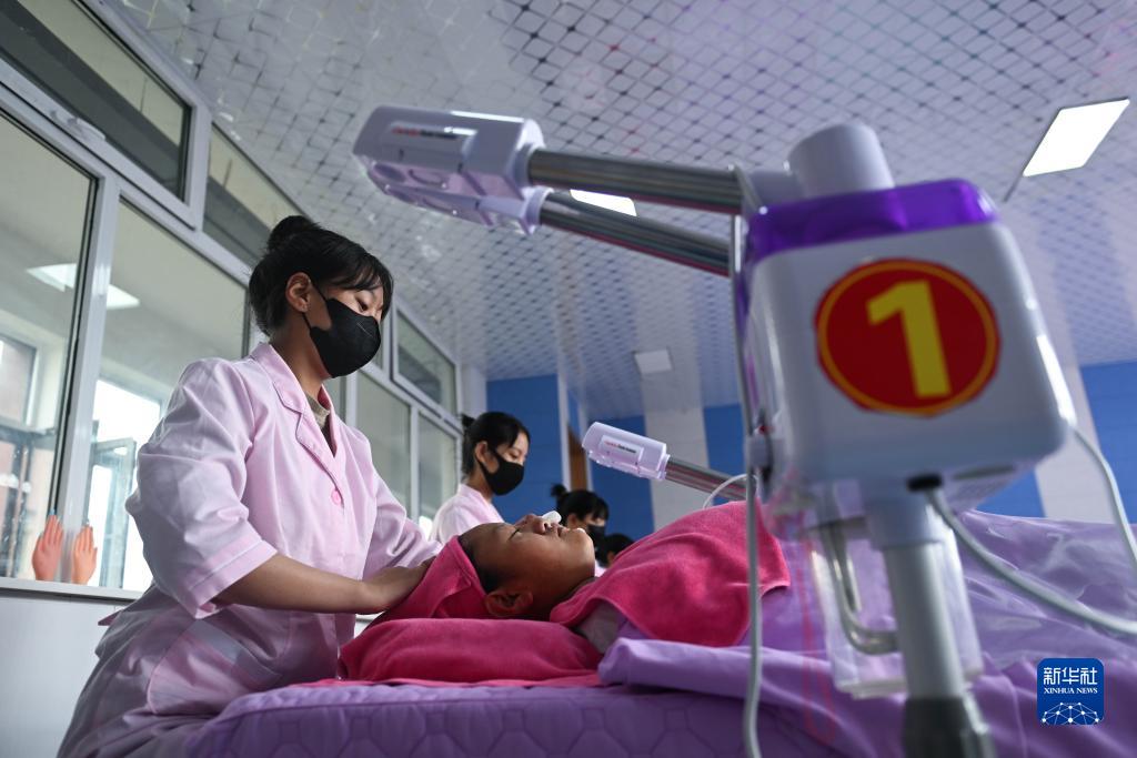 9月8日,在果洛藏族自治州職業(yè)技術(shù)學(xué)校,美發(fā)與形象設(shè)計(jì)學(xué)生在學(xué)習(xí)美容實(shí)訓(xùn)課程。新華社記者 張龍 攝