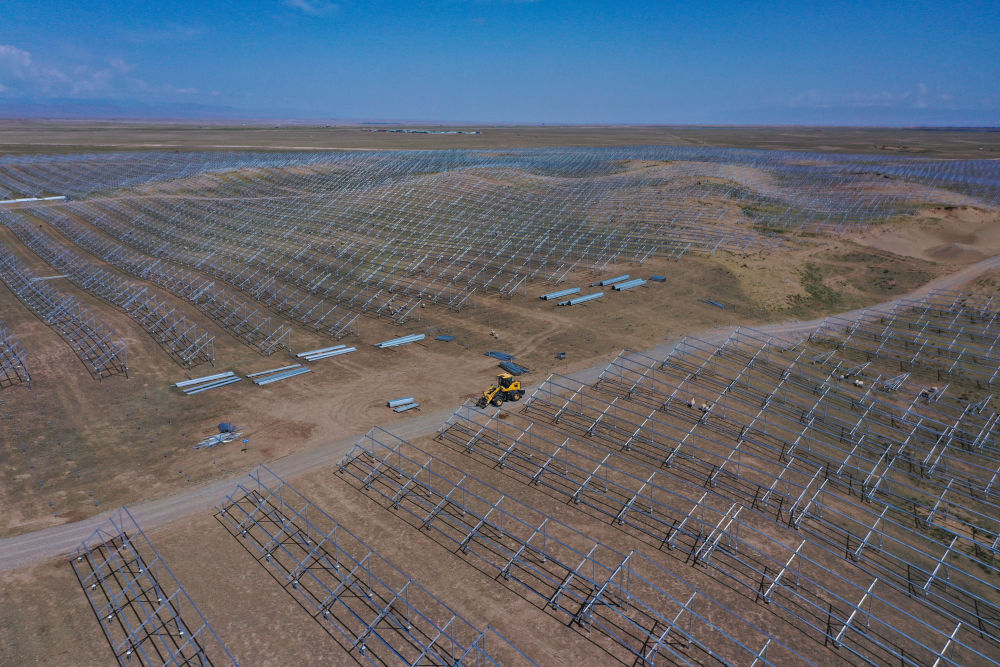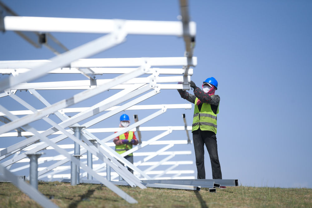 2022年6月8日,工人在黃河上游水電開發(fā)有限責任公司海南基地共和縣100萬千瓦光伏項目施工。新華社記者 張龍 攝