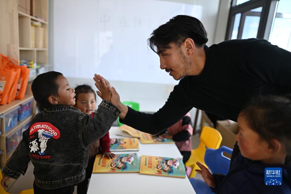 在青海省玉樹藏族自治州曲麻萊縣秋智鄉(xiāng)布甫村陽光幼兒園,秋智鄉(xiāng)幼兒園副園長才仁戰(zhàn)斗(右二)在課堂上和小朋友互動(dòng)(9月14日攝)。新華社記者 張宏祥 攝
