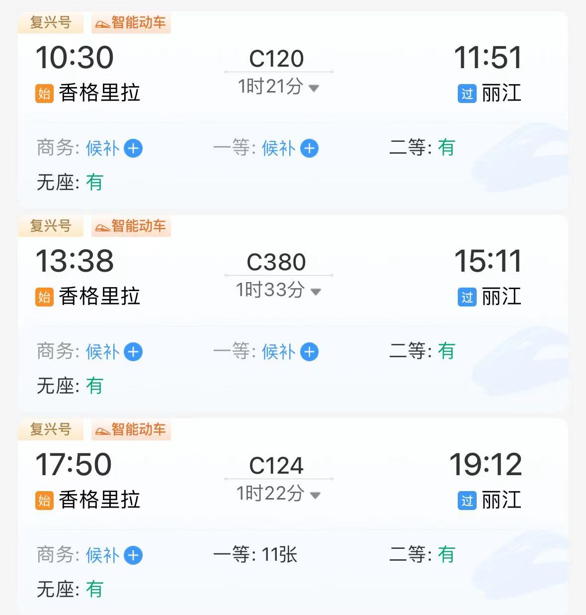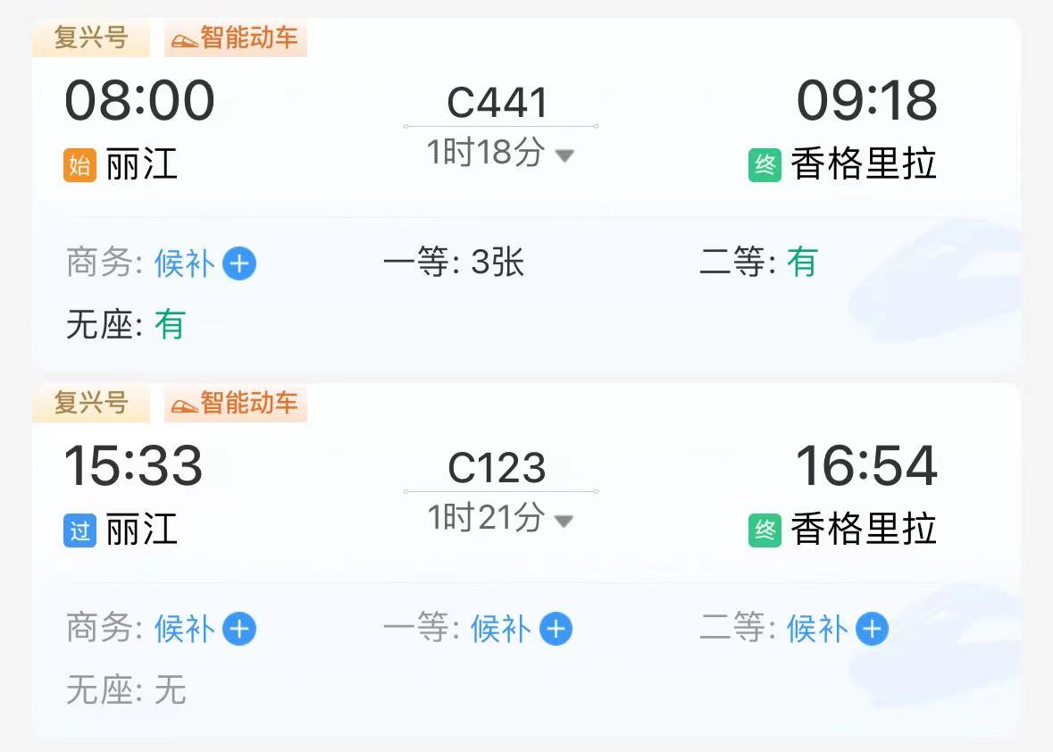 麗香鐵路開通至今熱度較高,鐵路12306購票平臺顯示,多趟班次已出現(xiàn)坐票售罄或無票的情況。根據(jù)香格里拉站工作人員建議,為保證沿線其他車站乘客購票,APP票量實時變動更新,建議買不到票的乘客實時刷新APP,買不到坐票的乘客可以上車后向乘務(wù)員詢問各車廂是否有空余座位。