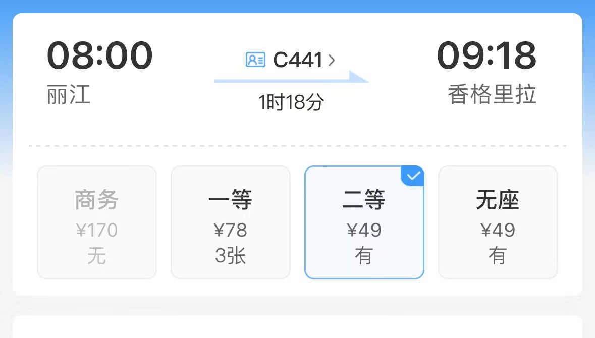 根據(jù)中國鐵路官方售票平臺-鐵路12306上的查詢結(jié)果,目前,麗江-香格里拉段每日共發(fā)出兩趟班次,最快1小時18分到達(dá)香格里拉站;香格里拉-麗江段每日共發(fā)出三趟班次,最快1小時21分到達(dá)麗江站。班次設(shè)置合理,基本可以保證上、中、下午時段的不同出行需求。