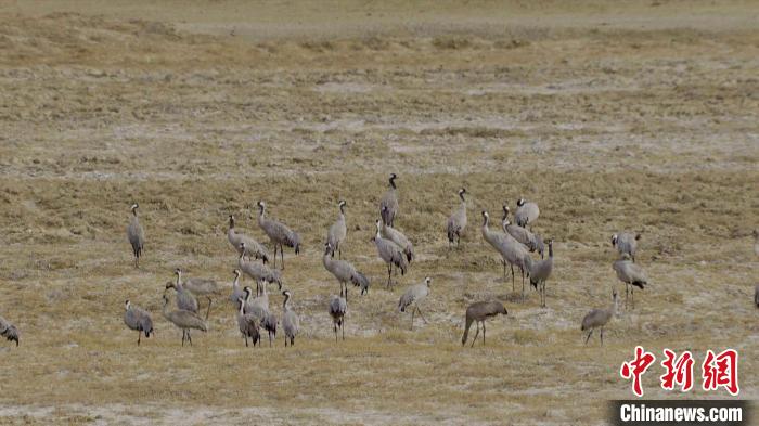 圖為灰鶴群在草地上嬉戲。仁增加措 攝