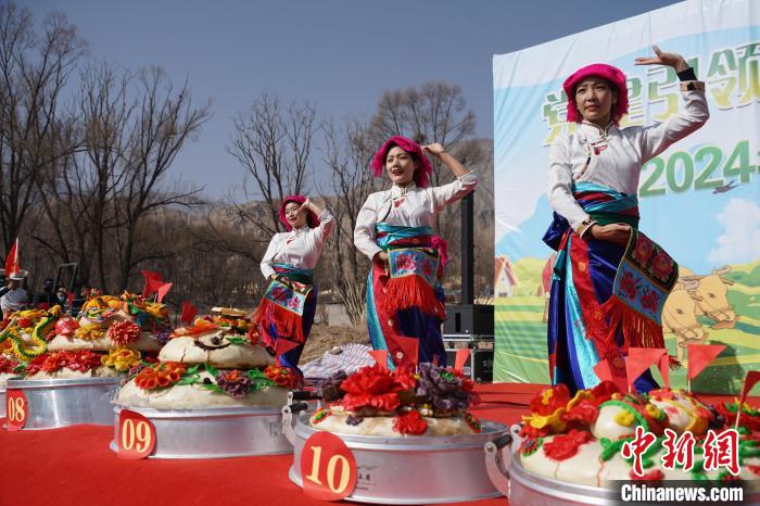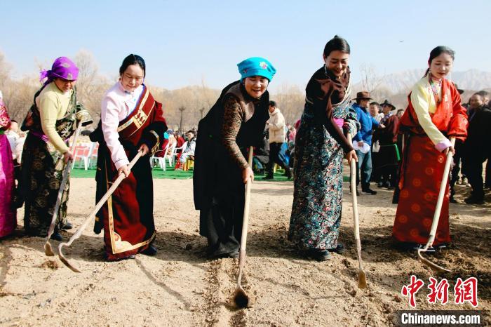 3月6日,青海省海南藏族自治州貴德縣拉西瓦鎮(zhèn)舉辦春耕文化節(jié)活動。該鎮(zhèn)十個村的村民身穿節(jié)日盛裝,手捧制作精美、色彩鮮艷,寓意風調雨順、五谷豐登的“彤糕”來到田間,以“二牛抬杠”的傳統(tǒng)方式開啟今春“第一犁”。