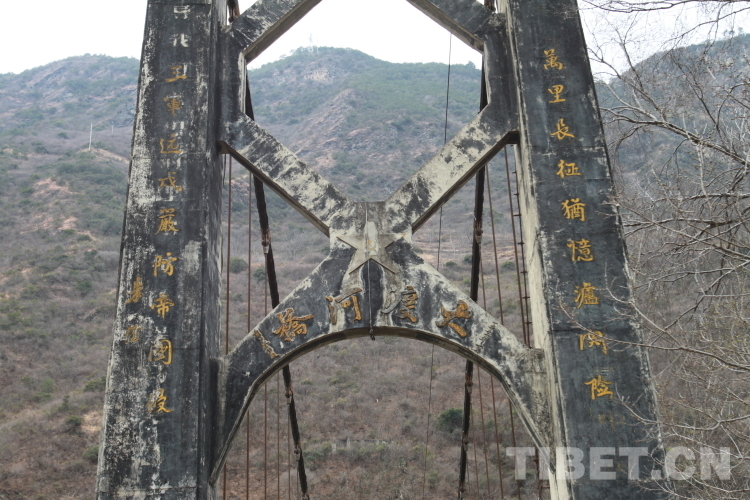 據(jù)了解,大渡河橋東西橋頭塔高分別為16米,孔徑132米,橋面4.5米,由27根直徑約3厘米大小的綱繩分布于左右兩側(cè),中間分別由45根同樣大小的鋼纜吊桿將橋身懸吊在大渡河上,橋身由無(wú)數(shù)鋼架鉚焊而成,鋼架之上鋪有約0.5米見(jiàn)方的方橙枕木,上鋪“人”字型拼木,允許載重量15噸。東西橋頭分別建有堅(jiān)固的崗?fù)?,西橋頭正面豎有三道屏墻,左為原中國(guó)人民解放軍第十八軍軍長(zhǎng)張國(guó)華,政委譚冠三撰寫(xiě)的碑文,中間書(shū)有毛澤東同志七律《長(zhǎng)征》詩(shī)手跡,右為建橋工程說(shuō)明。