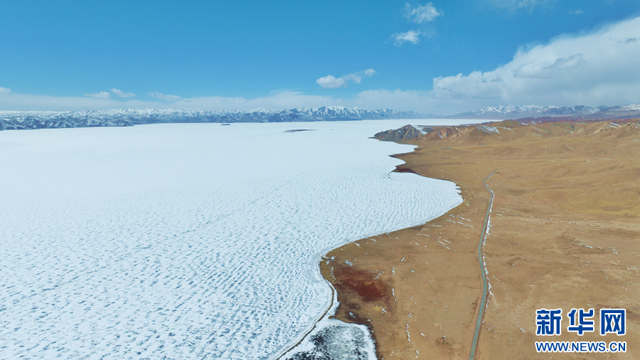 青海冬格措納湖冬景:半湖碧水半湖冰