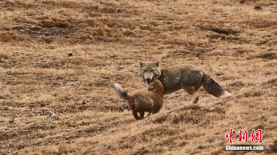 藏狐幼崽與媽媽嬉戲玩耍。蔡海勇 攝