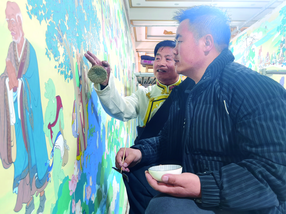 “小范,朱砂顏色有點厚,碗里再加點水,顏料稠度要合適,這樣顏料不易從畫布上剝落……”扎西尖措耐心地指導(dǎo)徒弟范慶基。每天,扎西尖措都會來畫室轉(zhuǎn)轉(zhuǎn),為徒弟指出繪畫、上色等方面的不足之處,幫助他們更快進步。