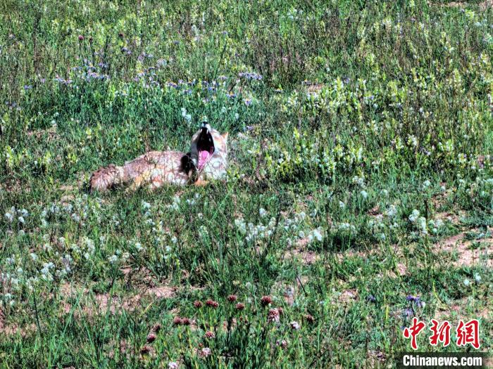 圖為藏狐在青海湖金沙灣的草地上打哈欠。中新社記者 李雋 攝