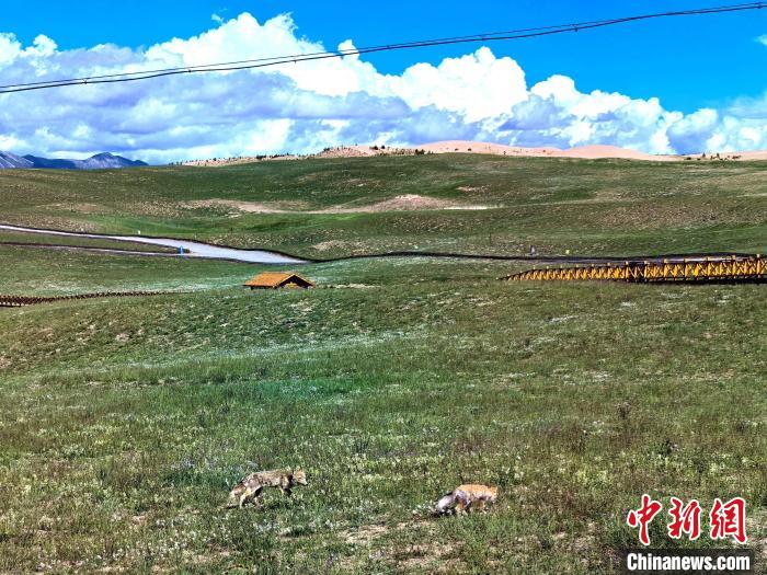 圖為小藏狐在青海湖金沙灣景區(qū)棧道旁追逐嬉戲。中新社記者 李雋 攝