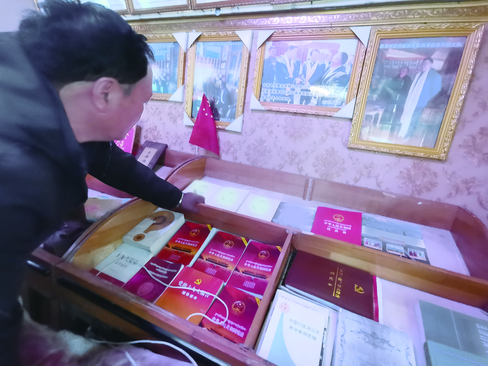 “十戶長(zhǎng)”葉哈特家中設(shè)有一個(gè)圖書(shū)角,政策、法律、民族團(tuán)結(jié)等方面的書(shū)籍都有,牧民們隨時(shí)都可以來(lái)家里閱覽。