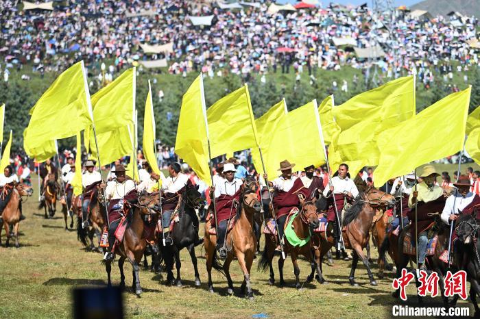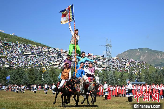 8月4日,藏族騎手在當(dāng)周草原上表演馬隊巡游。中新社記者 九美旦增 攝