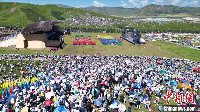 8月4日,人們在當(dāng)周草原觀看九色甘南香巴拉旅游藝術(shù)節(jié)開幕式表演。(無人機照片)中新社記者 九美旦增 攝