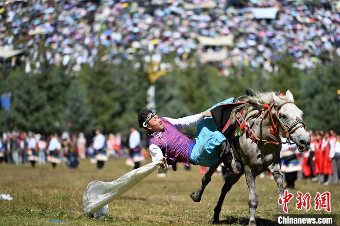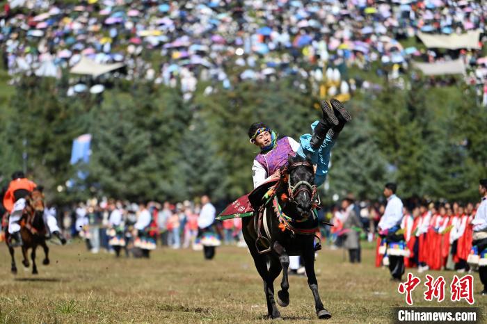 8月4日,藏族騎手在當(dāng)周草原上表演馬術(shù)。中新社記者 九美旦增 攝
