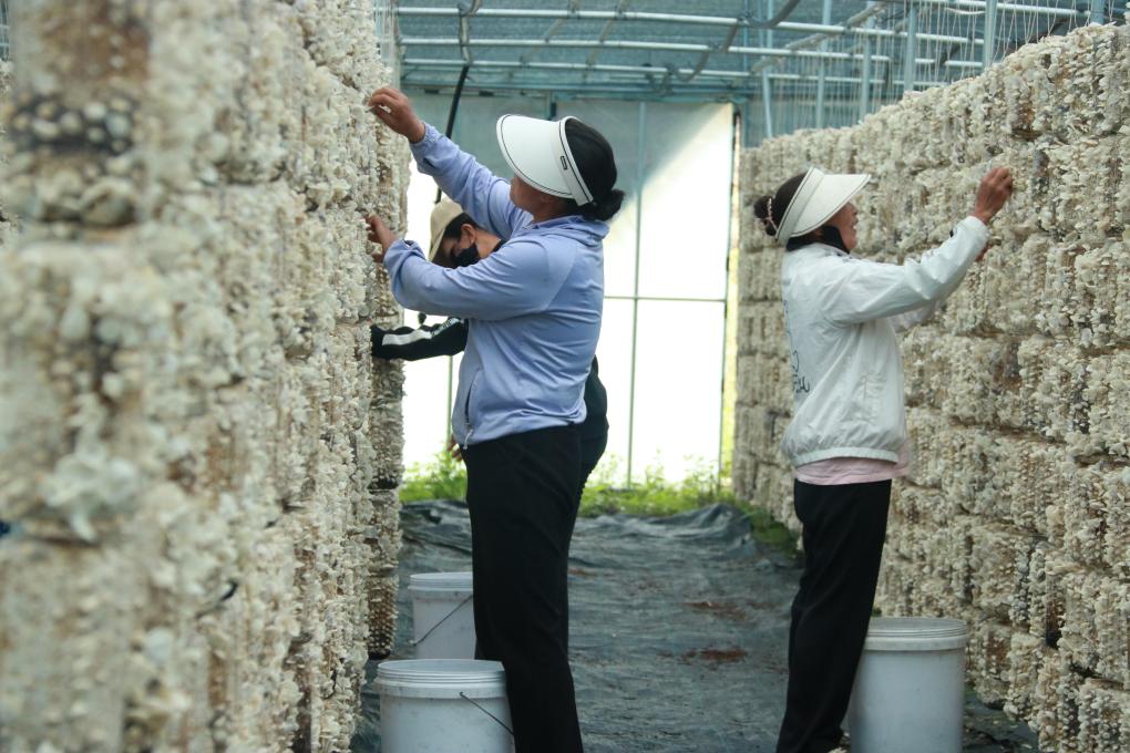尼傲鄉(xiāng)黑木耳種植基地內(nèi)的工人正在工作。新華社記者 李梓瀟 攝
