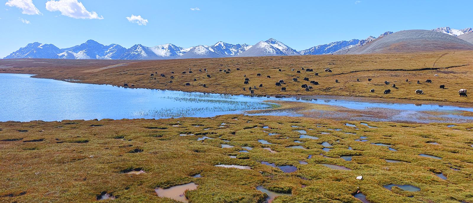 天遠(yuǎn)地闊,我們在草原上行駛了數(shù)小時(shí),眼前的風(fēng)景既相似又千變?nèi)f化。藍(lán)天和河流同樣鮮明澄澈,初秋的短草已經(jīng)開始泛黃,時(shí)不時(shí)能看到野生動物出沒,藏野驢、藏羚羊、黑頸鶴……
