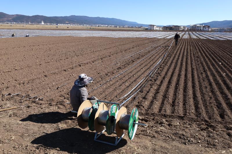 近日,記者在香格里拉市建塘鎮(zhèn)尼史村布倫村民小組看到,工人們正忙著在萵筍基地里鋪設(shè)水管、覆膜、培土,為節(jié)后種植萵筍做好準(zhǔn)備。