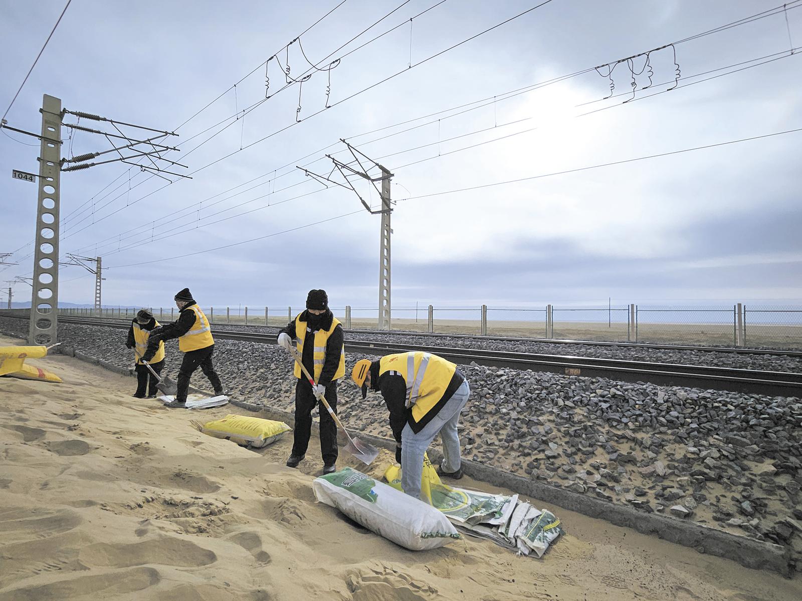 多年來,工區(qū)職工們反復(fù)探索,積累經(jīng)驗,采用“草方格”“石方格”“擋沙墻”“HDPE低立式防沙板”等一系列防沙治理措施,有效固定了流沙。但風(fēng)不停息沙不止,風(fēng)沙依舊不時侵入線路。