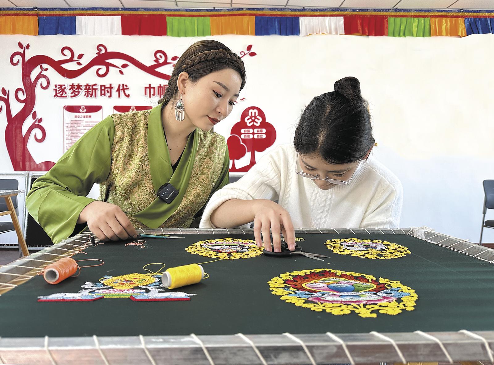 德吉措正教學(xué)生刺繡。受訪者供圖