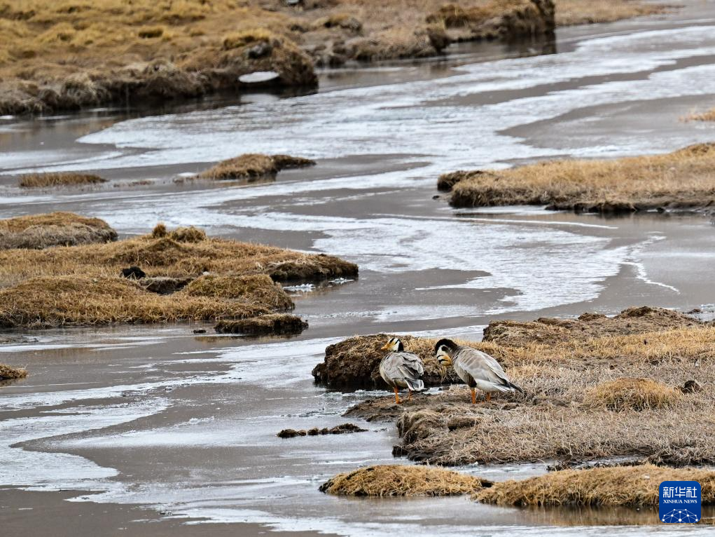4月8日,兩只斑頭雁在青海隆寶國(guó)家級(jí)自然保護(hù)區(qū)內(nèi)活動(dòng)。新華社記者 張龍 攝