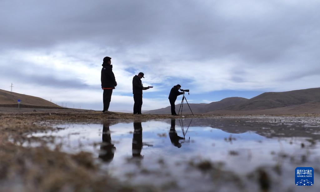 4月8日,青海隆寶國(guó)家級(jí)自然保護(hù)區(qū)生態(tài)管護(hù)員才仁多杰(右一)和同伴一起觀測(cè)候鳥(無(wú)人機(jī)照片)。新華社記者 張宏祥 攝