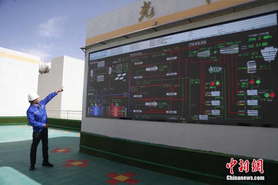 4月15日,在青海省海西蒙古族藏族自治州德令哈市,青海中控50MW光熱電站總工程師樊玉華介紹項(xiàng)目實(shí)時(shí)數(shù)據(jù)。該光熱電站是中國(guó)首批光熱發(fā)電示范項(xiàng)目之一,也是全球首個(gè)年發(fā)電量超過年設(shè)計(jì)發(fā)電量的塔式熔鹽儲(chǔ)能光熱電站。裝機(jī)容量達(dá)50MW,鏡場(chǎng)采光面積達(dá)54.27萬平方米,配置有7小時(shí)熔鹽儲(chǔ)能系統(tǒng),每年可節(jié)約標(biāo)準(zhǔn)煤約4.8萬噸,減排二氧化碳?xì)怏w約12.4萬噸。中新社記者 馬銘言 攝