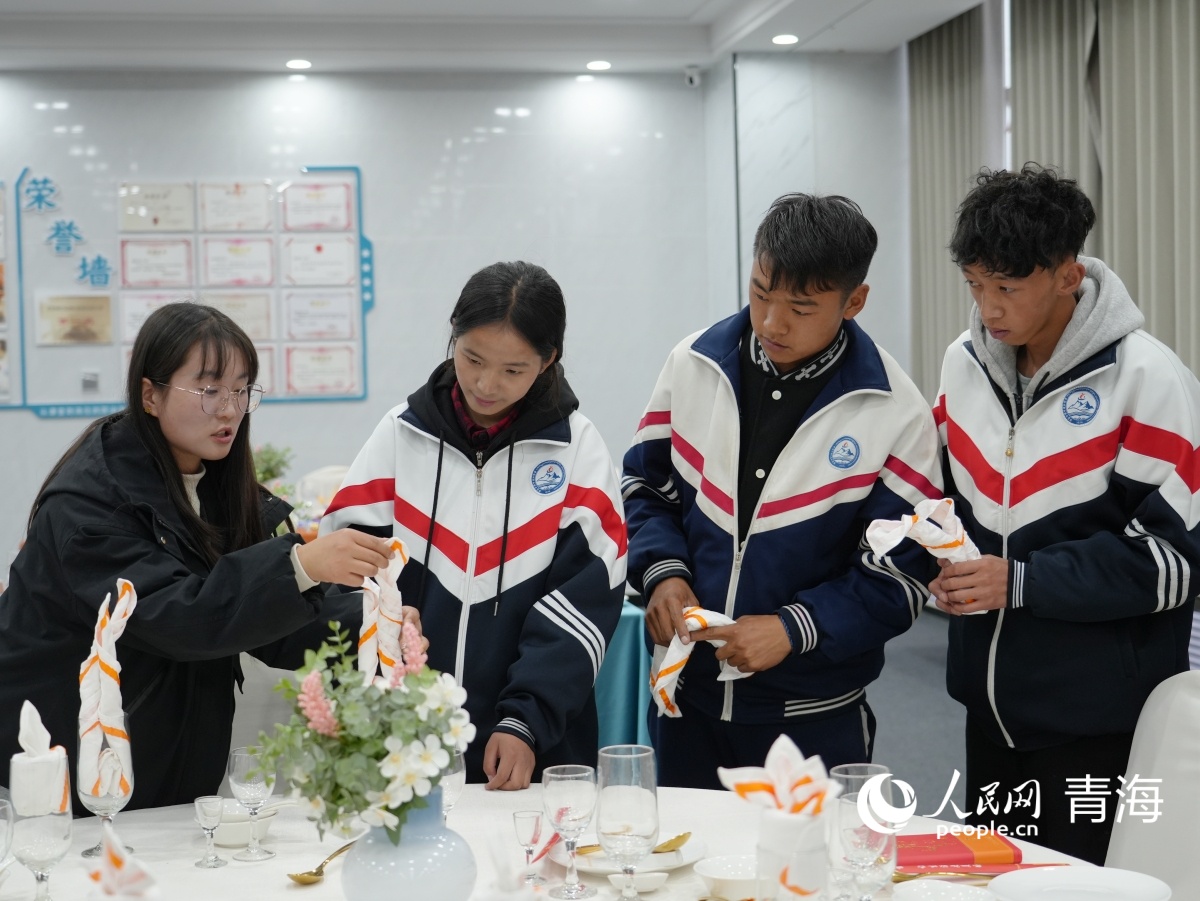 高星級飯店運營與管理專業(yè)學生學習餐飲擺臺。人民網(wǎng)記者 楊啟紅 攝