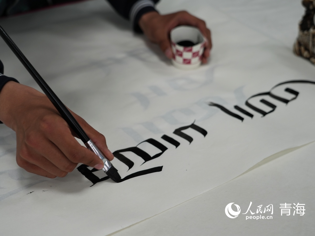 高星級飯店運營與管理專業(yè)學生展示德昂灑智書法技藝。人民網(wǎng)記者 楊啟紅 攝