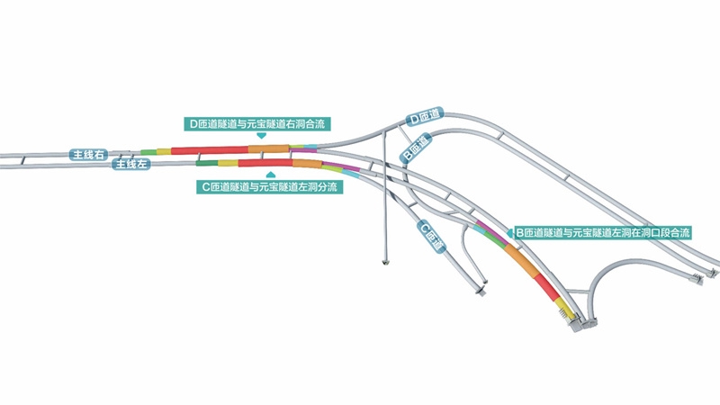 最大的挑戰(zhàn)之一是隧道交疊。在元寶樞紐地下互通中,B匝道隧道與主線元寶隧道左右洞上下交叉,共有三個交叉影響段落,分別是95米、70米、50米,上下隧道垂直高差最短處僅為33厘米,相當于上下兩條隧道幾乎緊緊挨在一起,而兩條隧道總開挖高度又接近21米,相當于7層樓高?!霸谒淼郎显傩匏淼?,稍有不慎就可能引發(fā)垮塌等事故?!绷沃拘f,交疊隧道的部分還未施工,因為項目是世界之最,可供參考的案例很少,目前正和科研團隊一起,研究系統(tǒng)化的技術解決方案,為山區(qū)大型地下互通建設探路。