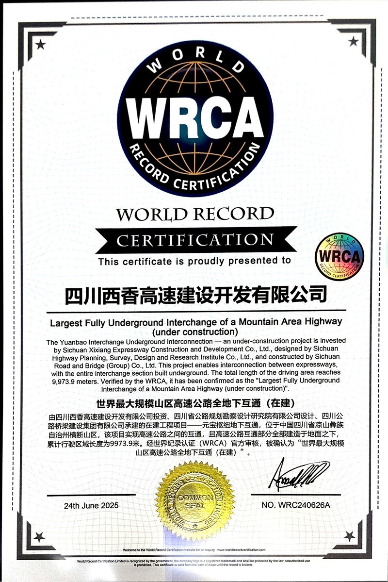 日前,西香高速公路元寶樞紐地下互通,被WRCA(世界紀錄認證公司/機構)認證為“世界最大規(guī)模山區(qū)高速公路全地下互通(在建)”。WRCA是全球包括中國唯一獲批相關世界紀錄認證商標的機構。