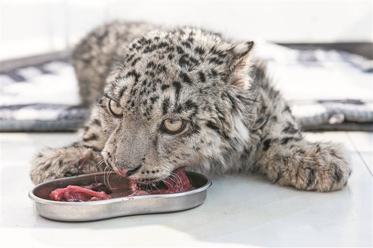 這只每天對著鏡頭認(rèn)真吃飯、翻身打滾的小雪豹從外形上看,已與同齡的正常雪豹幼崽無明顯差別,很難讓人想起3月4日在玉樹藏族自治州治多縣被發(fā)現(xiàn)時那個瘦成“一張皮”的雪豹幼崽的樣子。