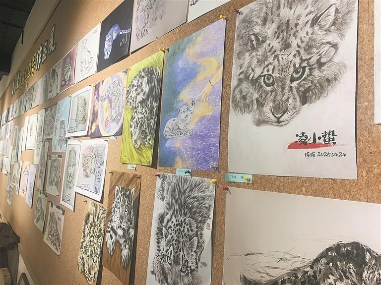 獲救時蜷縮的身影、被工作人員抱起時的乖巧模樣、恢復(fù)活力時騰躍的瞬間,在西寧野生動物園2323高原生靈實驗室二樓的展示墻上,120余幅以“凌小蟄”為主人公的繪畫作品被陳列展出。