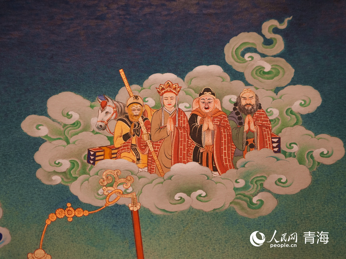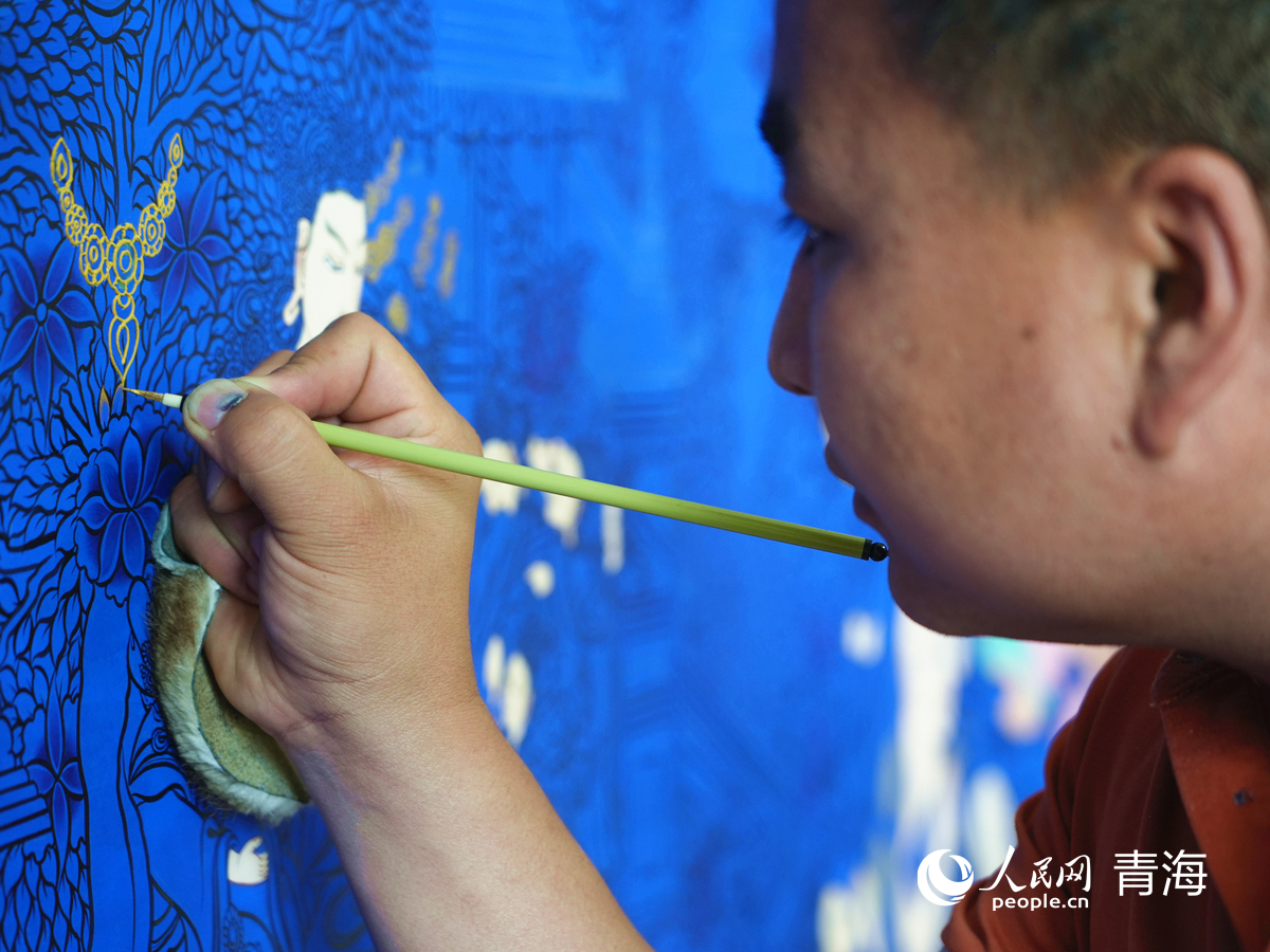 仁俊畫院畫師正在創(chuàng)作援青主題唐卡作品。人民網(wǎng)記者 楊啟紅 攝