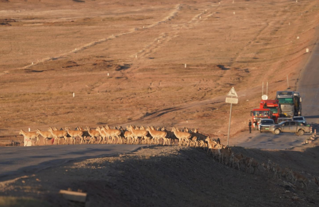 繁忙的公路突然“靜音”,遠處車流、人群安靜等待,幾只藏羚羊緩慢踏上公路,頭羊反復“試探”確認安全后,羊群再迅速穿過公路。