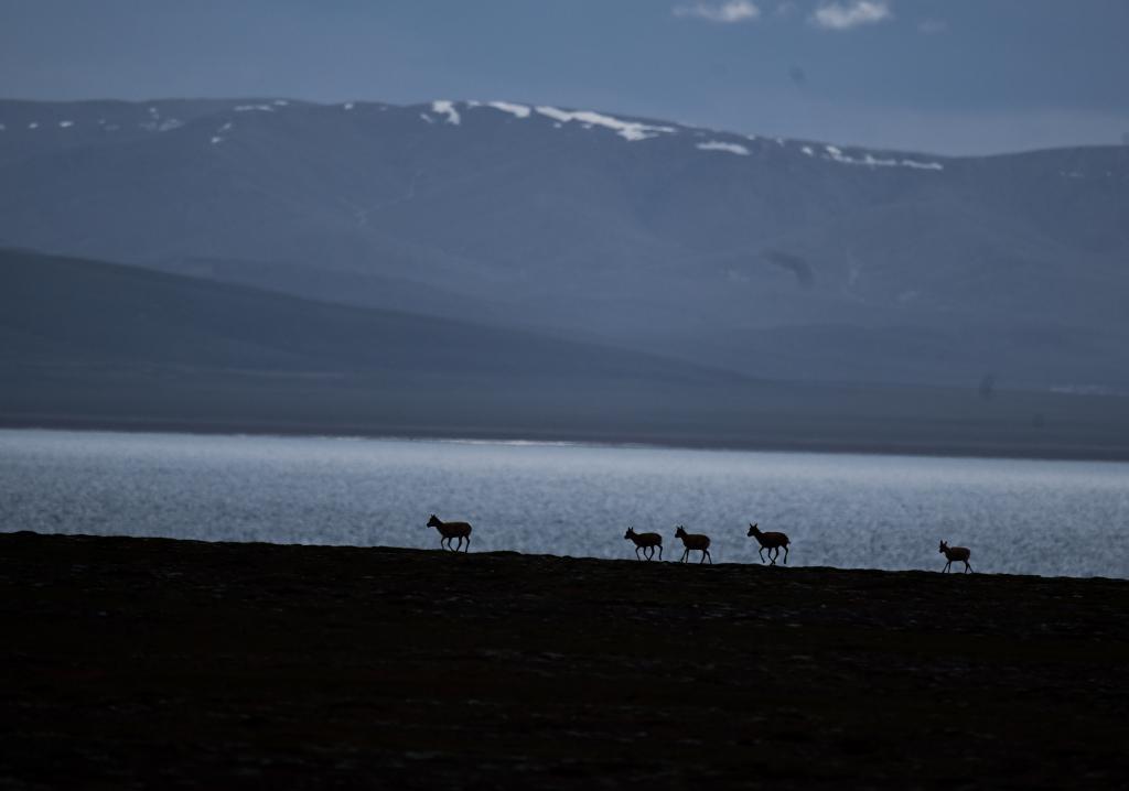 在可可西里卓乃湖區(qū)域,幾只藏羚羊在活動。 新華社記者 張龍 攝