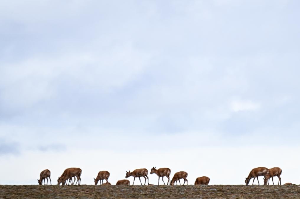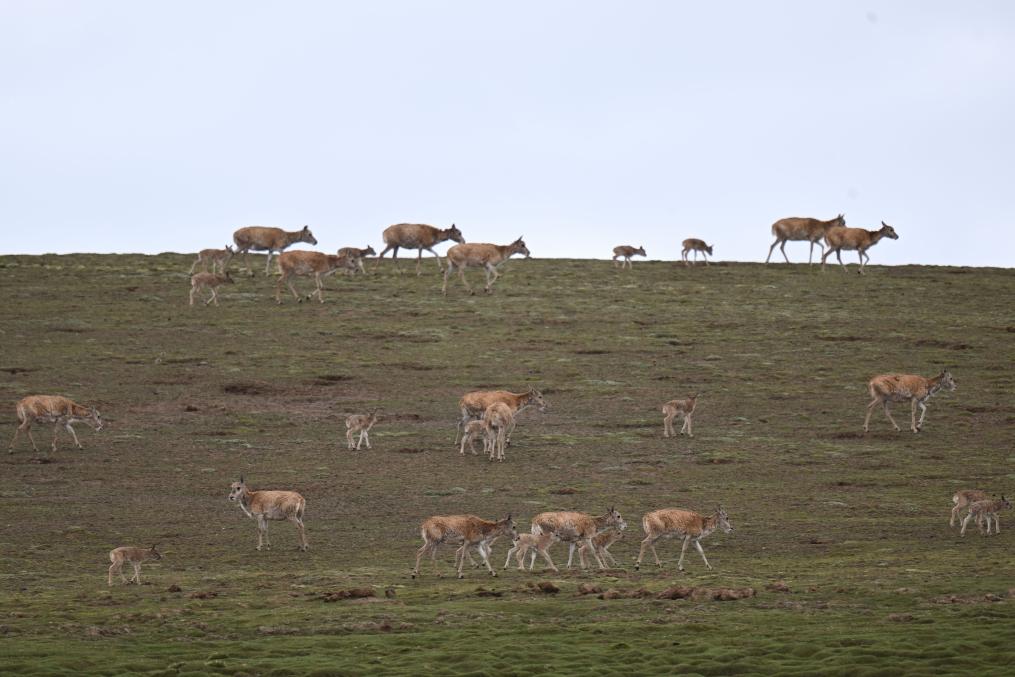 在可可西里卓乃湖區(qū)域,一群藏羚羊在活動。新華社記者 張龍 攝