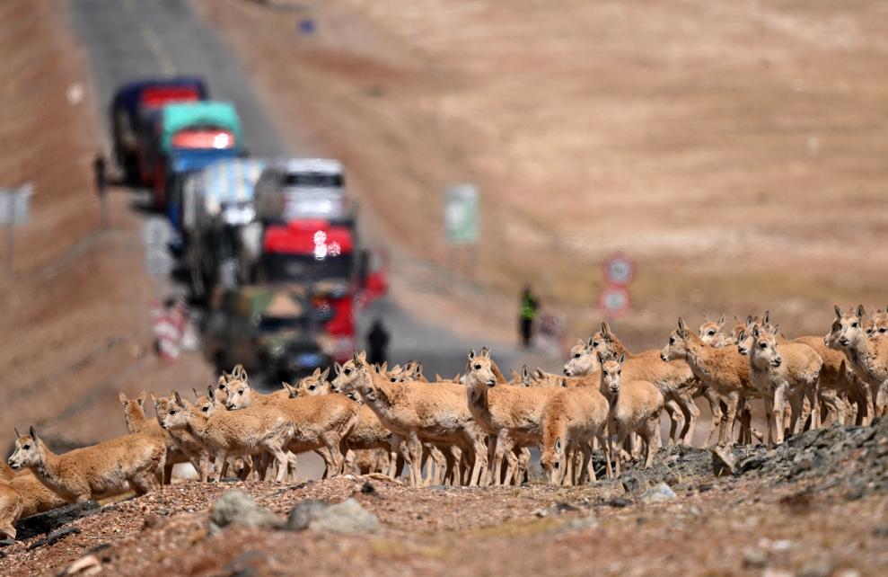 一群待產(chǎn)雌性藏羚羊通過青藏公路前往可可西里卓乃湖產(chǎn)仔。新華社記者 張宏祥 攝