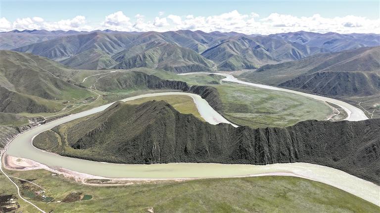 9月16日,從青海省果洛藏族自治州久治縣出發(fā),沿花久高速公路行駛約一小時(shí)后,抵達(dá)門堂鄉(xiāng)果囊村。這里有黃河首曲女兒灣,之所以稱為“女兒灣”,是因?yàn)辄S河在這里出青海省境,流到甘肅省甘南藏族自治州瑪曲,又回繞至黃南藏族自治州河南蒙古族自治縣,形成一道壯美的自然回環(huán),貌似出嫁的女兒回望家鄉(xiāng)。