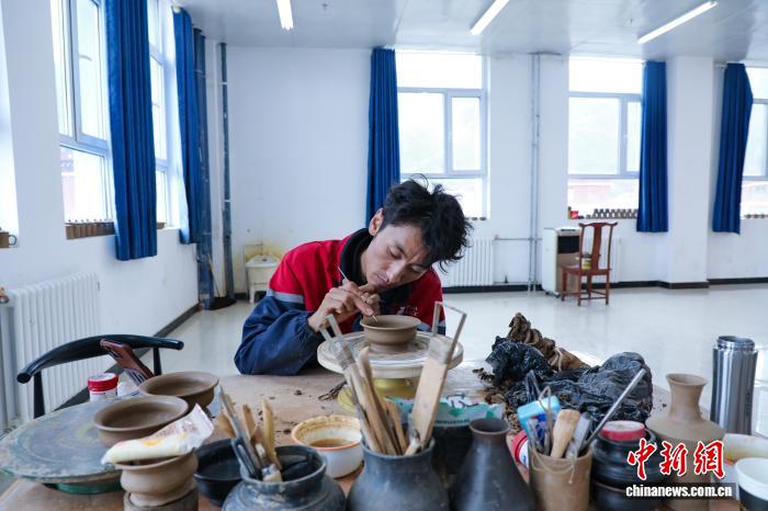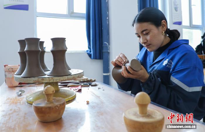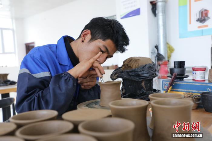 圖為藏式手工藝制作第四代傳承人果洛謝格太檢查陶器是否陰干。中新社記者 馬銘言 攝