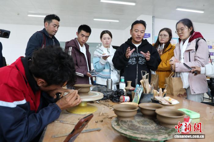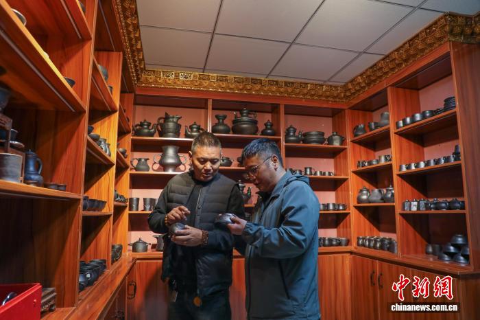 圖為藏式手工藝制作第四代傳承人果洛謝格太(右三)向記者團(tuán)介紹班瑪黑陶制作流程。中新社記者 馬銘言 攝