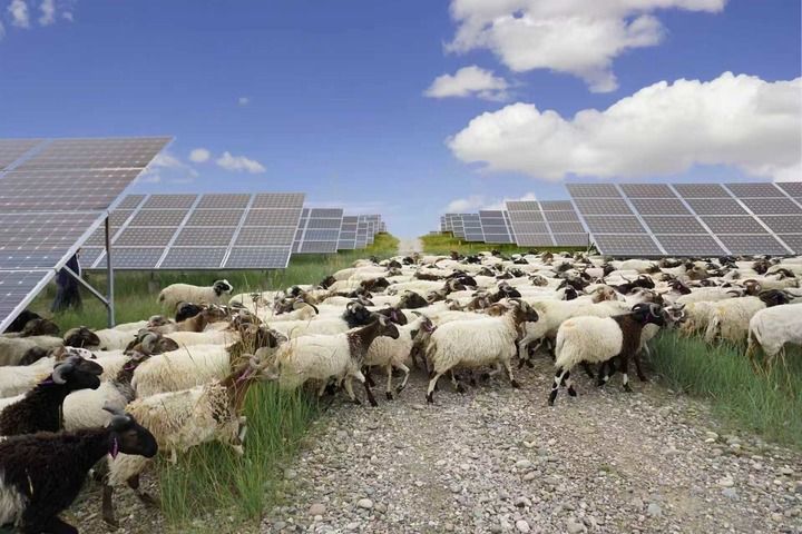 綠草如茵接天涯,牛羊成群映彩霞。每年6月至10月,塔拉灘周邊牧民的羊群都可以免費(fèi)進(jìn)入光伏園區(qū)吃草,羊群在光伏板下活動(dòng),排泄的糞便成為草場(chǎng)的天然肥料,促進(jìn)板下植被健康生長(zhǎng),形成良好生態(tài)循環(huán)。