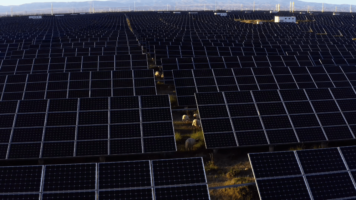 塔拉灘,蒙古語意為“荒灘”,這里風(fēng)沙肆虐、草木難生。當(dāng)?shù)卣畬⒛抗怄i定這片不毛之地——高海拔、長(zhǎng)日照的特質(zhì),2012年,一排排光伏板在戈壁扎根,未曾想,意外之景也隨之出現(xiàn)。光伏電站的大面積建設(shè)擋住了一些風(fēng)沙,地表的蒸發(fā)量進(jìn)一步減少,導(dǎo)致了草長(zhǎng)得越來越旺盛。