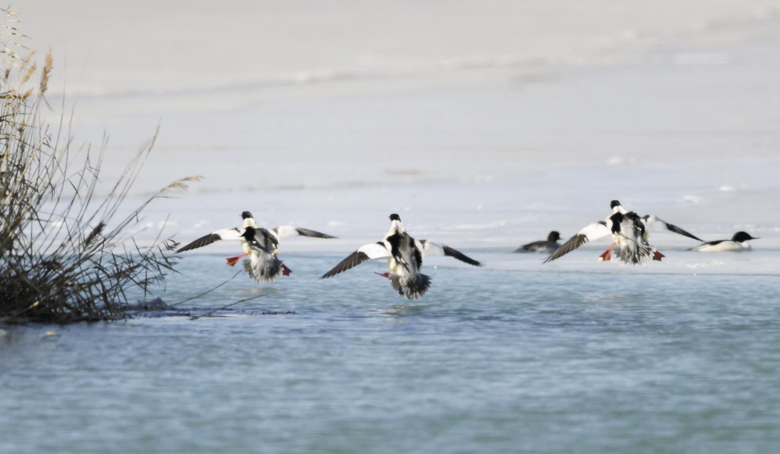 返程的路上,一幕場景讓所有人都停下了腳步——兩只白尾海雕穩(wěn)穩(wěn)地蹲在濕地冰面凸起的冰凌上,它們跟前有一汪沒結(jié)冰的小水池,幾只普通秋沙鴨居然就在池里慢悠悠地游著,面對近在咫尺的天敵,竟顯得坦然自若。沒有追逐,沒有驚慌,就這么安靜地共享著這片小水域。